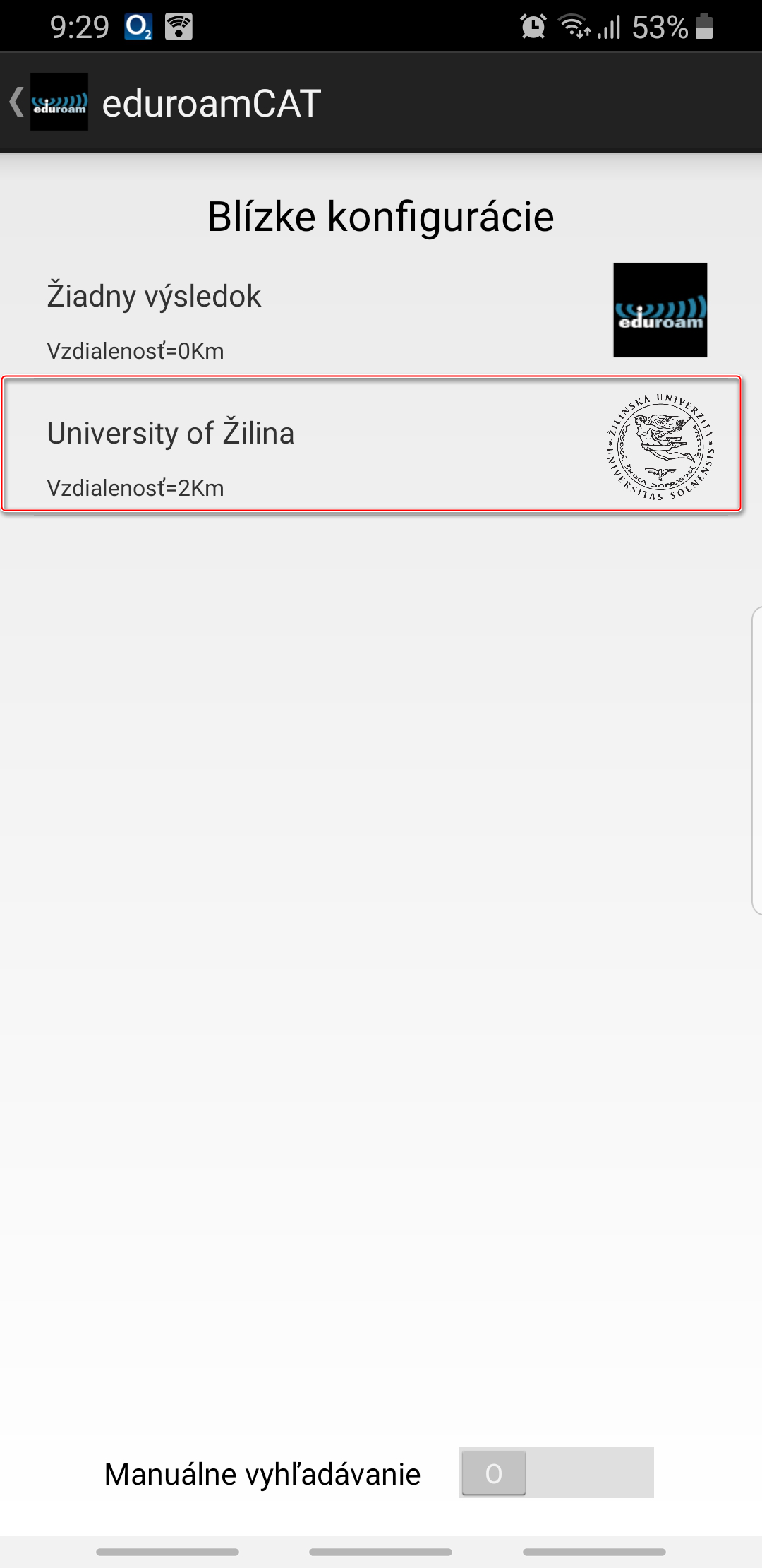 Vyberte inštitúciu, pre ktorú chcete nakonfigurovať sieť eduroam (University of Žilina).