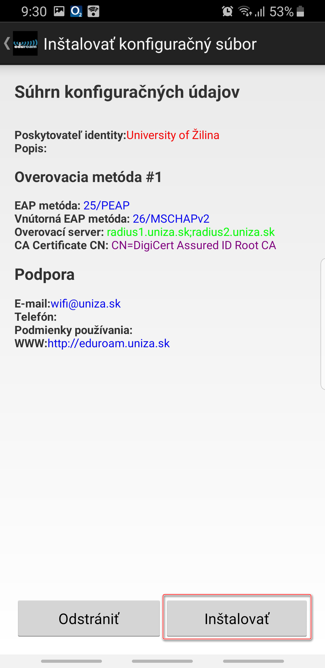 Aplikácia automaticky vyhľadá konfiguračný profil siete. Pokračujte stlačením Inštalovať.