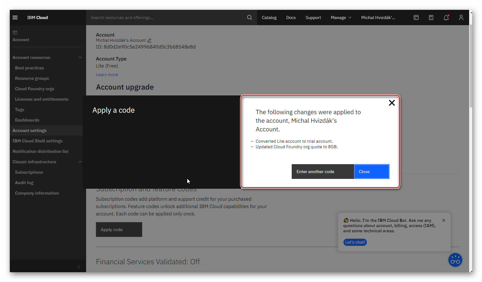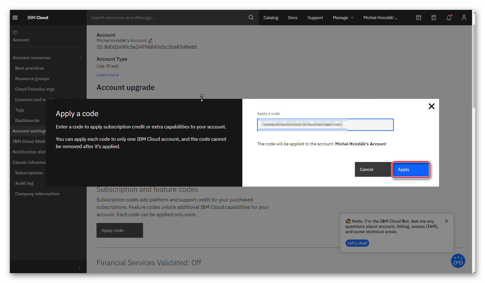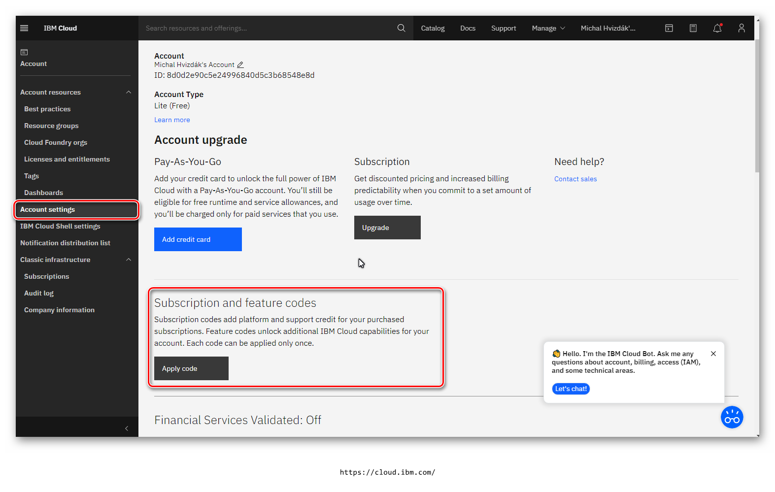 Postupujte podľa návodu nižšie pre získanie feature kódu pre IBM cloud.