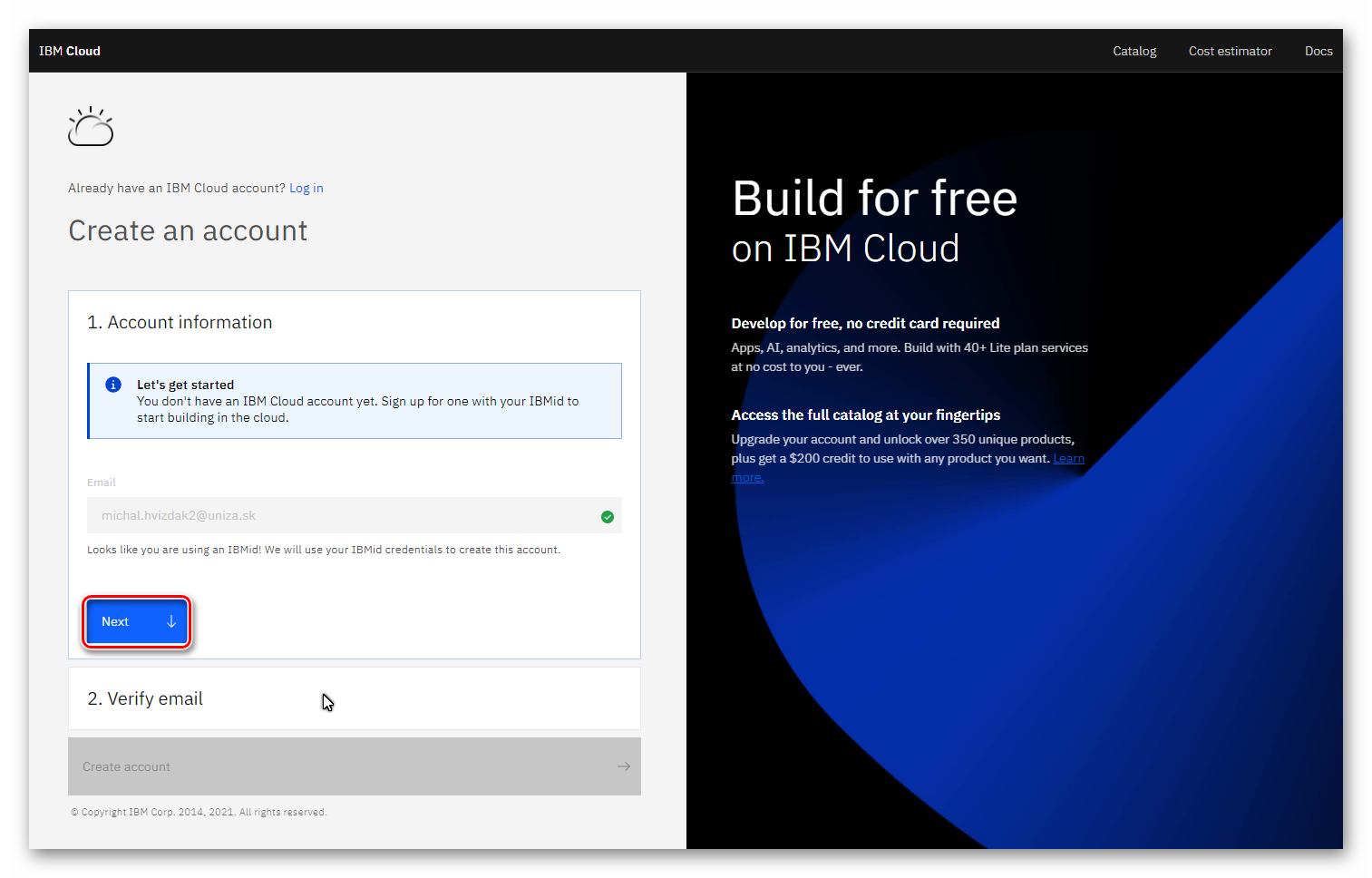 Na úvodnej obrazovke použite váš IBM Id účet na prvotnú registráciu do IBM Cloud.
