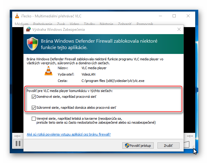 Stiahnutý playlist (ik_playlist.xspf) otvorte vo VLC Media Player a povoľte komunikáciu VLC Media Player v sieti.