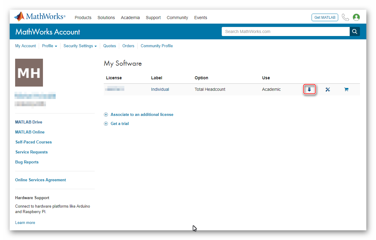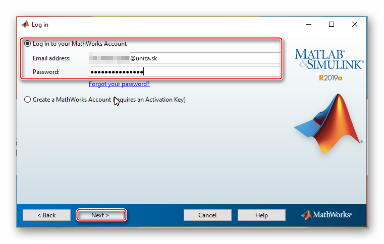 Na stránke www.mathworks.com sa prihláste s vašim vytvoreným osobným účtom.
