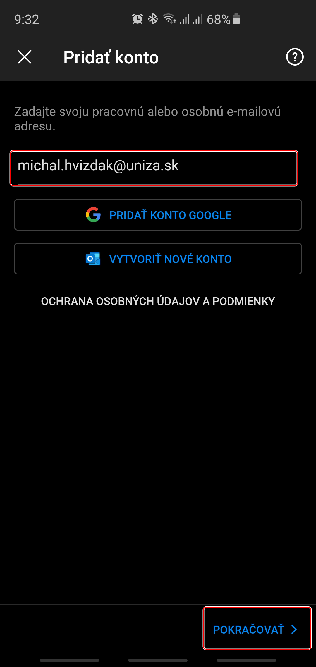 Po spustení aplikácia kliknite na tlačidlo Začať a zadajte vašu univerzitnú e-mailovú adresu: