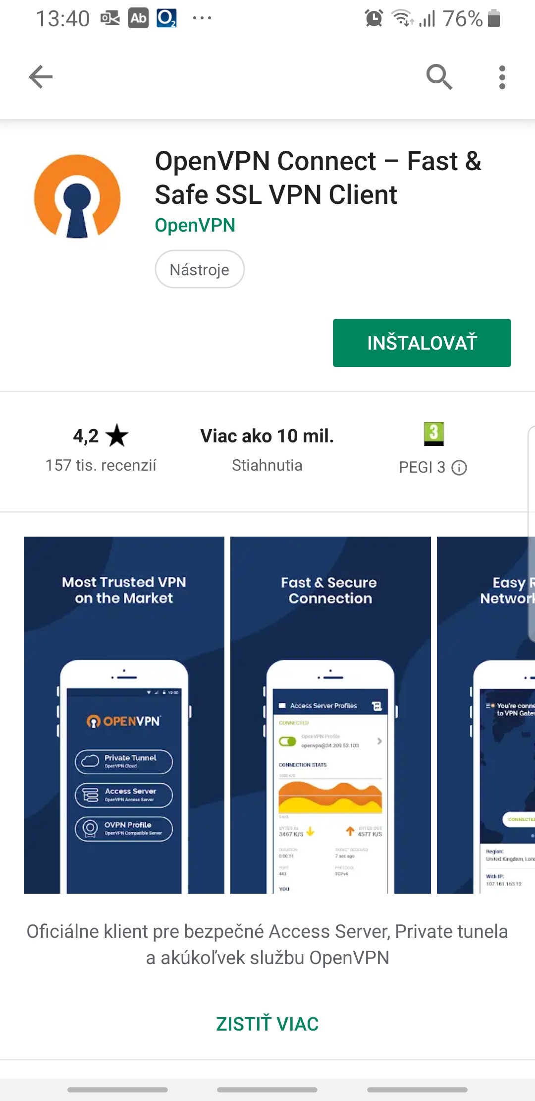 V obchode Google Play vyhľadajte aplikáciu OpenVPN Connect a nainštalujte ju do vášho smartfónu.