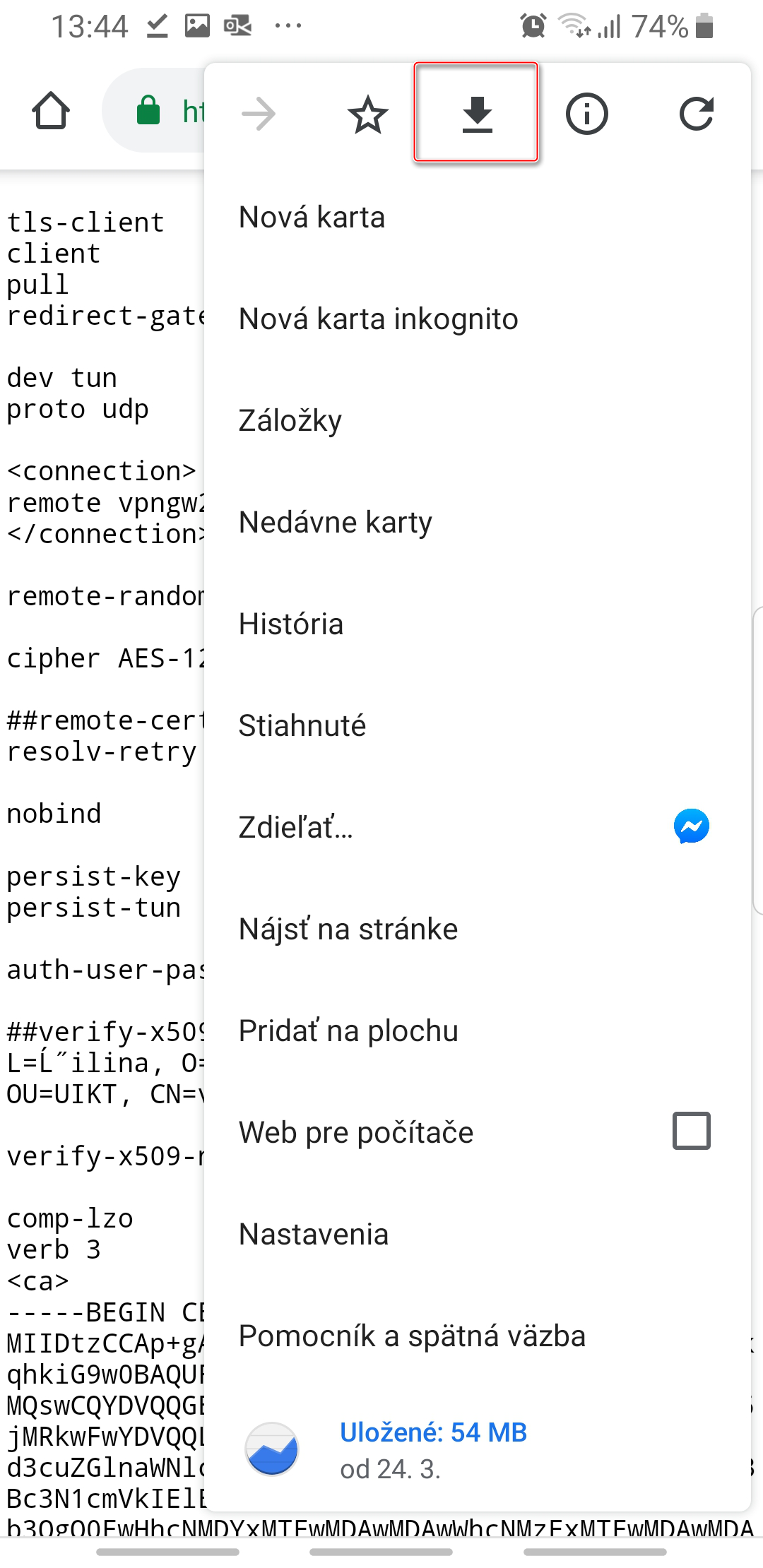 Vo webovom prehliadači na vašom smartfóne prejdite na stránku: https://ikt-n.uniza.sk/apps/vpn/vpngw2.uniza.sk.ovpn a súbor uložte.