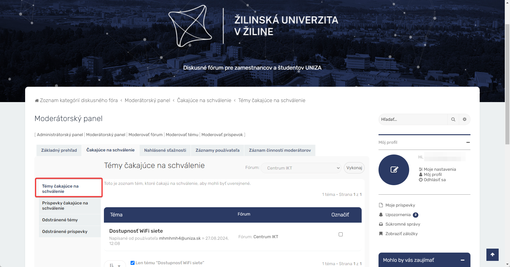 V diskusných skupinách je možné vytvárať aj ďalšie témy, ak je to potrebné pre prehľadnosť diskusií. Témy môže vytvárať ktorýkoľvek používateľ a rovnako ako príspevky v diskusných skupinách podliehajú schváleniu moderátorom. Postup schválenia novej témy je podobný, ako v prípade schvaľovania nového príspevku. Notifikáciu o požiadavke na novú tému nájdete v časti „Moderátorský panel„.