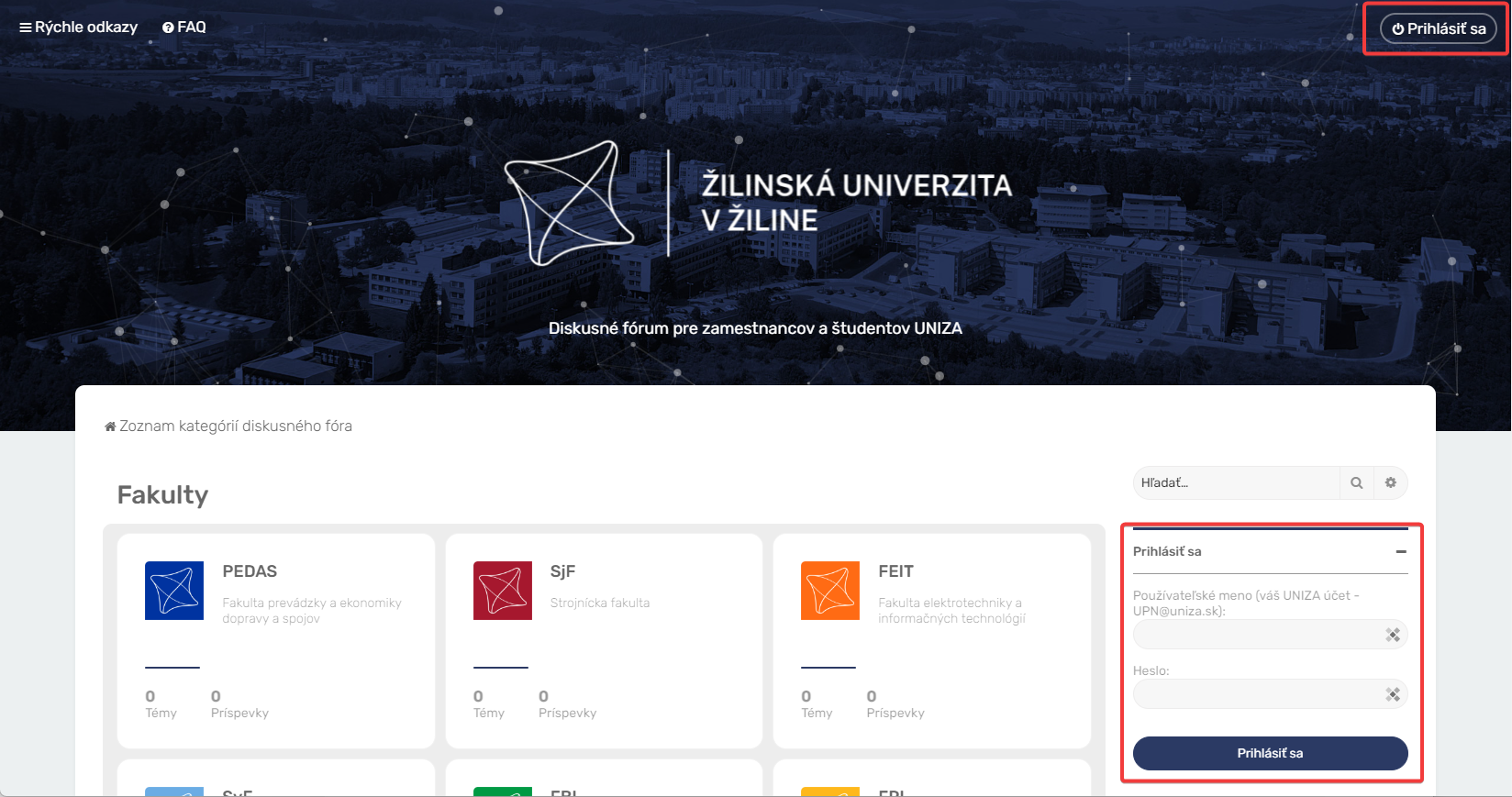 Na úvodnej stránke diskusného fóra je možné prihlásiť sa pomocou widgetu vpravo, alebo kliknutím na tlačidlo vľavo hore.