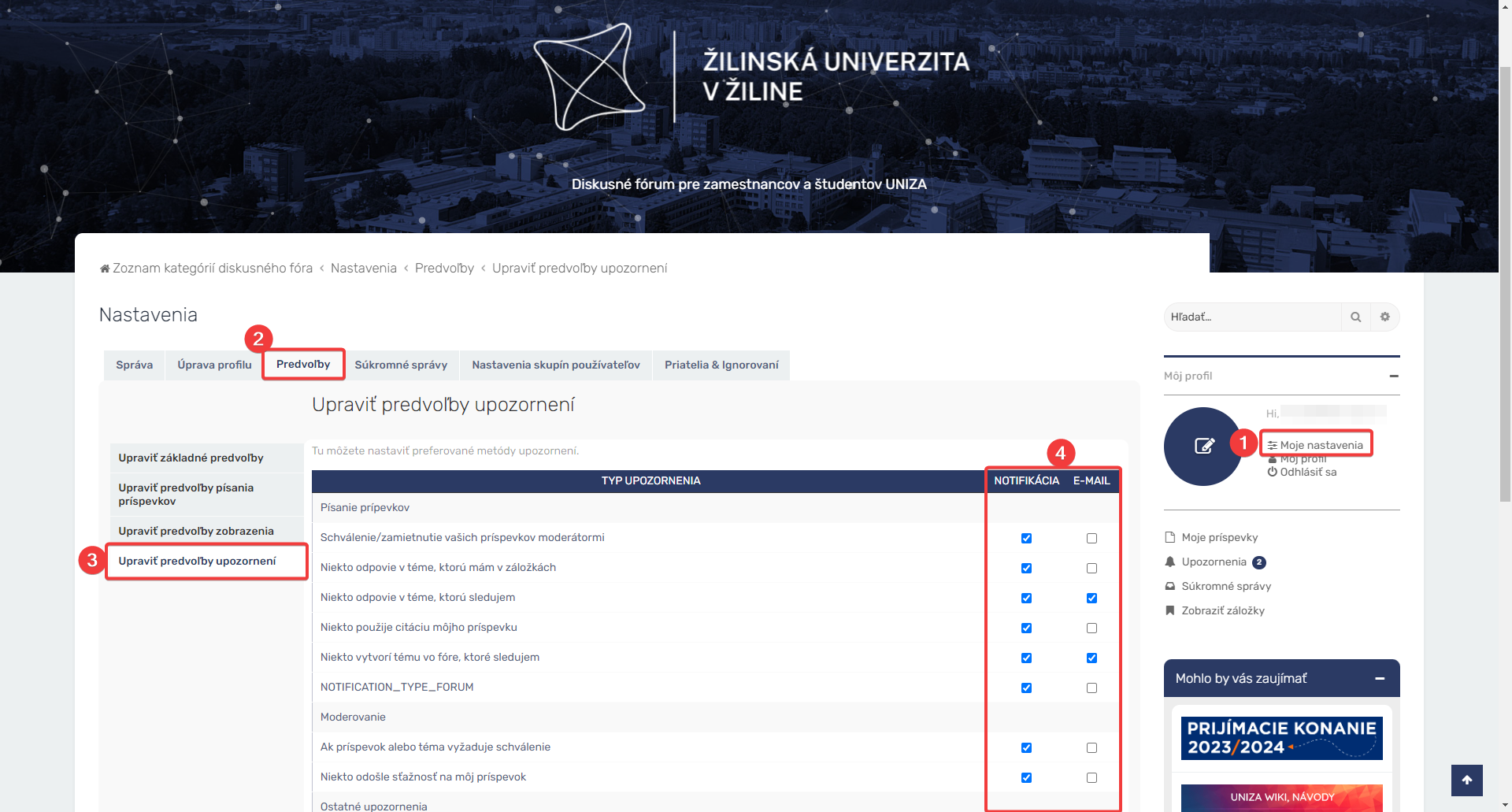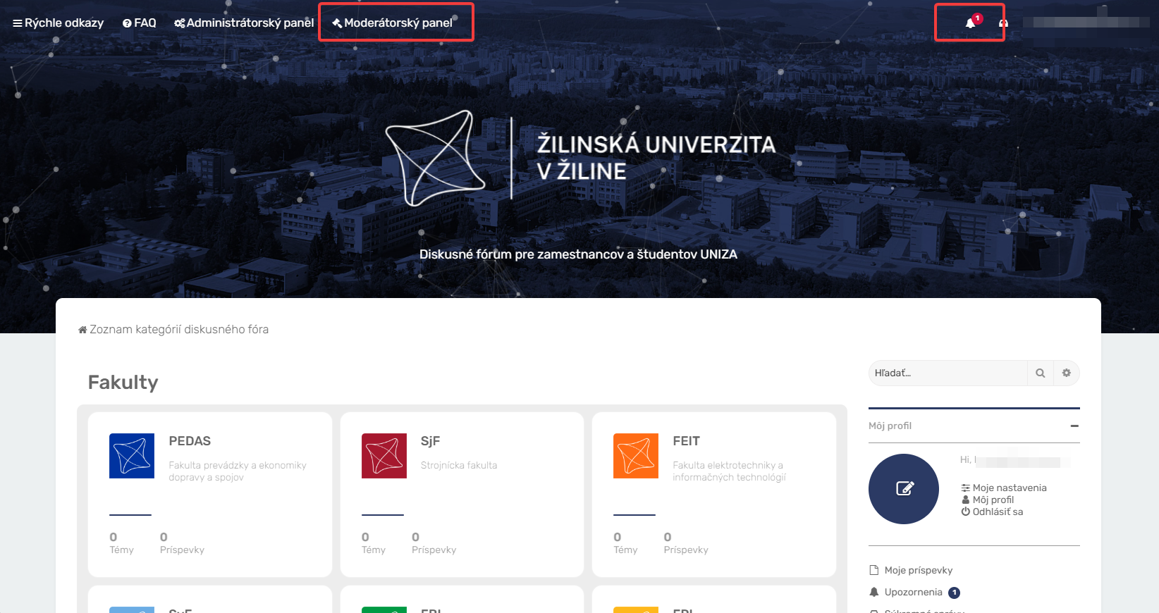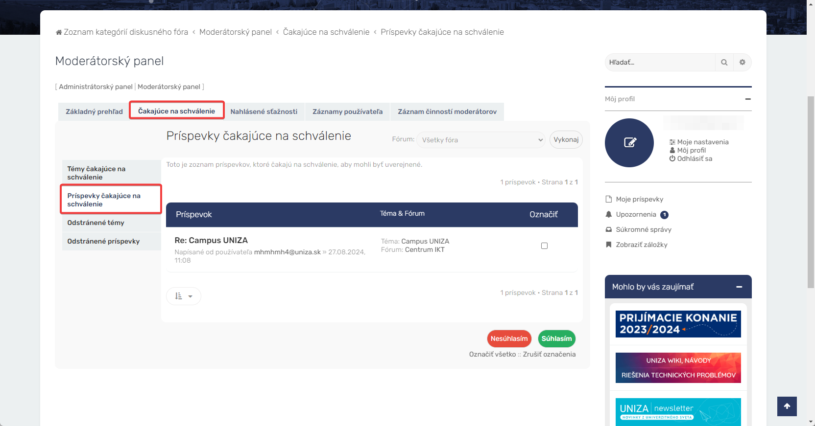 Notifikácie na nové príspevky a požadované schválenie nových príspevkov a tém sa moderátorovi zobrazujú štandardne po prihlásení do diskusného fóra UNIZA a sú vopred nastavené.