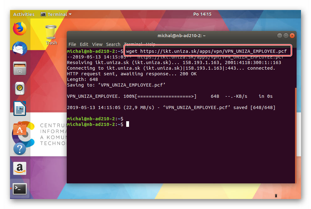 Pomocou príkazu wget si stiahnite z adresy https://ikt-n.uniza.sk/apps/vpn/VPN_UNIZA_EMPLOYEE.pcf konfiguračný súbor klienta.