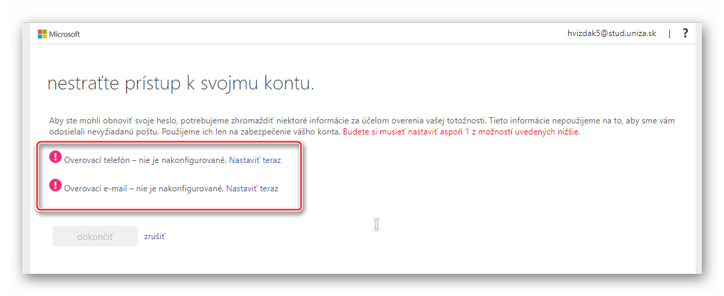 Po overení t.č. môžete pridať ešte overovací e-mail (postup overenia je rovnaký) alebo kliknite na Dokončiť.
