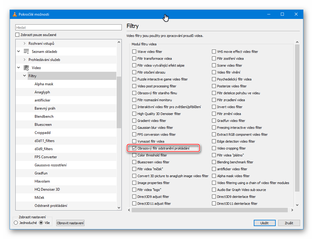 Označte Obrazový filtr odstranění prokládaní (Deinterlace video filter).