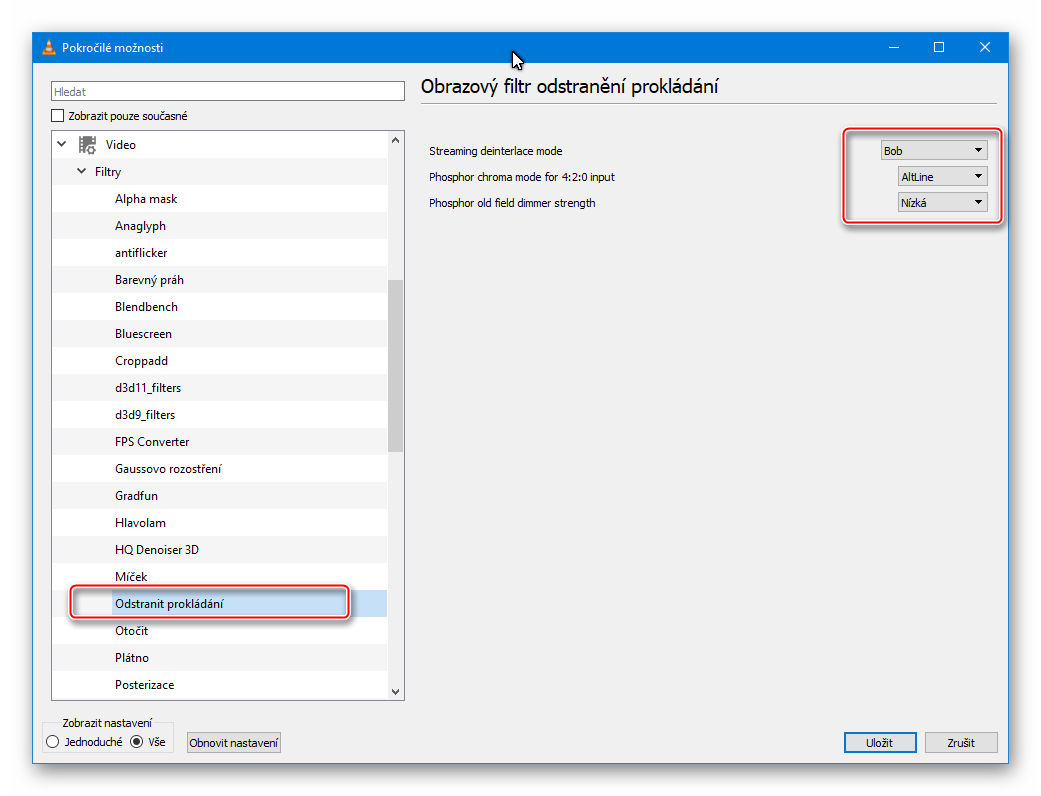 Prejdite do menu Video -> Filtry -> Odstraniť prokládání a nastavte podľa obrázku.